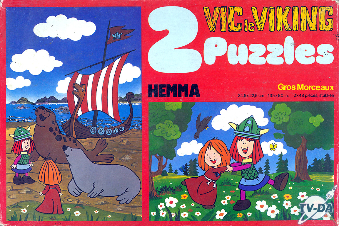 Vic le viking et Halvar (puzzle) Marque : Jig Saw Référence : 1119 Année : 1975 Pièces : 63 Format : 28 x 21,5 cm Matière : Carton Divers :