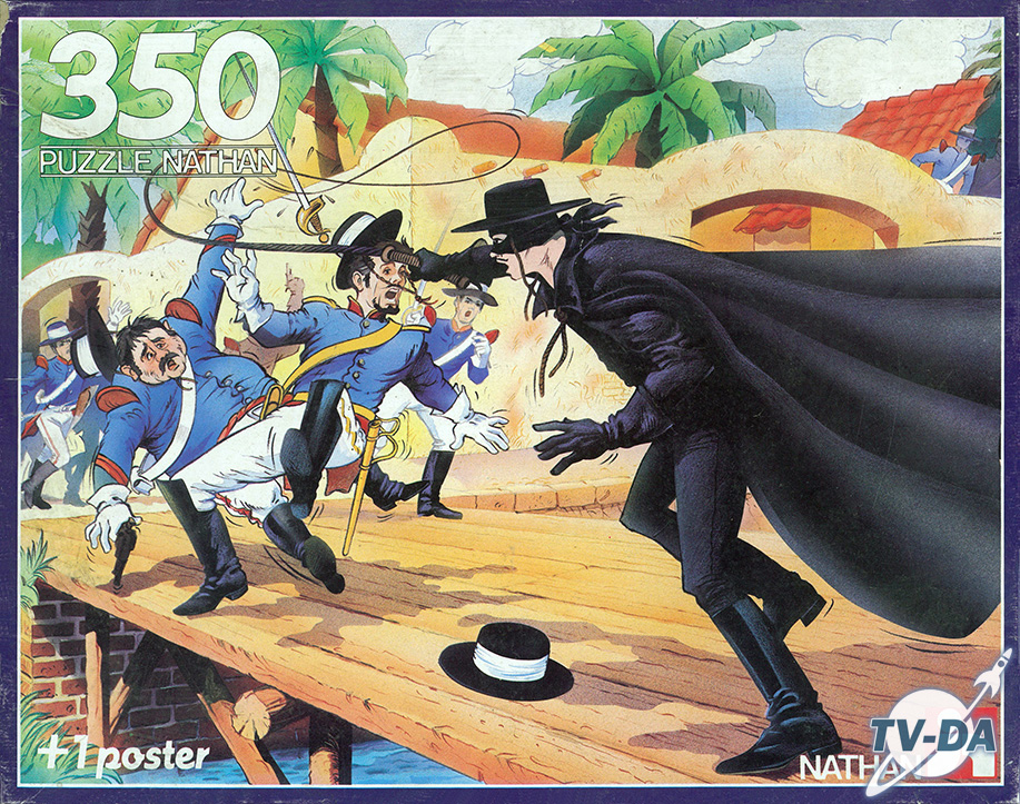 Zorro - Le justicier (puzzle) Marque : Nathan Référence : 555 285 Année : 1986 Pièces : 350 Format : 34,5 x 49,5 cm Matière : Carton Divers : Poster